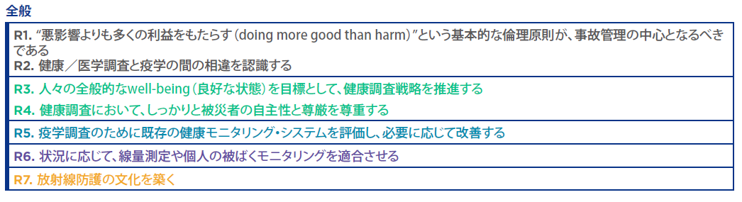この報告は、EU諸国が研究資金を供出するEC(ヨーロッパ委員会)が採択したSHAMISEN(Nuclear Emergency Situations - Improvement of Medical And Health Surveillance)プロジェクト(https://www.isglobal.org/en/-/shamisen)の研究成果になります。主幹研究所は、スペインのISGlobal(バルセロナ世界保健研究所)であり、このプロジェクトの主任研究者はProf. Elisabeth Cardisです。SHAMISENプロジェクトは18か月のプロジェクトを通して、ヨーロッパや日本の19施設からの参加者とアメリカ、ロシア、ウクライナやベラルーシの専門家と一緒に原子力災害の急性期、初期から長期へかけての何の対応をしたか(もしくは、何の対応をしなかったか)について調査でした。このプロジェクトは主にスリーマイルアイランド原発事故やチョルノービリ原発事故、福島第一原発事故などの過去の原発事故からの教訓をまとめました。このような原子力災害からの「教訓」は準備と対応や被災者への健康調査への改善に対する提案内容の基盤になります。加えて、放射線災害としての倫理的な影響や経済問題なども考慮されました。また、専門家との打ち合わせは我々の提案の効果や影響を最大限に引き出すため、プロジェクトを通して実施されました。このプロジェクトの最終的な勧告は、2017年5月に放射線災害における準備、初期や中期への対応、復興期の改善に役立つ28項目として報告されました。またそのうちの7項目の一般原理に関する勧告は、危害よりも利益をもたらすことの倫理的な原則の包括的な内容に加えて、様々なタイプの事故や災害へ応用可能であるとされておりました。さらに、この勧告は被ばく線量評価、避難と屋内退避、健康調査、疫学調査やコミュニケーションとトレーニングなどの広範囲で詳細な内容を記載しています。(下記:勧告の概要)