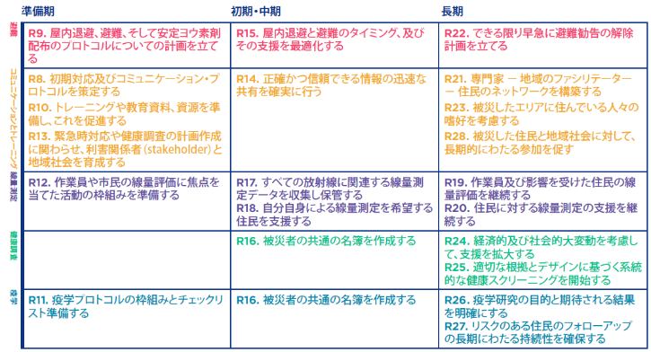 SHAMISEN-SINGS(Nuclear Emergency Situations - Improvement of dosimetric, Medical And Health Surveillance - Stakeholder INvolvement in Generating Science)プロジェクトは約2年間でEU、ウクライナ、日本(福島医大を含む)の研究者間での議論を通して、2020年6月に推奨事項を報告しました(https://www.isglobal.org/en/-/shamisen-sings)。この研究は前プロジェクト(SHAMISENプロジェクト)の勧告に基づいて、放射線線量や健康/福祉を示す指標などのデータの収集の支援を新たなデジタルデバイスを活用しながら原子力に関連した防災や事故からの復興における住民参加を促すことを目的としていました。図の日本語版のSHAMISEN-SINGSプロジェクトからの推奨事項は、線量測定、健康と福祉、データ管理計画、倫理指針の4項目となっています。この推奨事項の適応は、a)公的機関および公衆衛生と放射線防護の専門家、b)アプリ開発者、c) 一般市民が対象者でした。