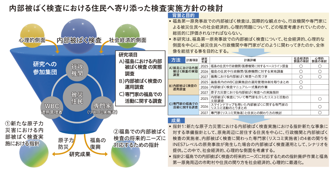 内部被ばく検査は、行政機関主導で実施された大規模な検査になります。内部被ばく検査は、ホールボディカウンター(WBC)装置による体外計測法が主体です。この内部被ばく検査は、福島県全域で被災住民の内部被ばく線量低減だけでなく、リスクコミュニケーションの一部として活用されてきました。しかしながら、事故から15年以上経過し、内部被ばく検査の全体像を総括する活動は、未実施のままになります。また、2017年にEUの研究プロジェクトの報告の中で放射線防護行為に追加して、被災住民の全般的なWell-beingの向上に社会経済的、心理的側面にも取り組むことが重要とされてきました。ここから、福島第一原子力発電所事故での内部被ばく検査は、国際的な観点から、行政機関や専門家による被災住民への社会経済的、心理的問題について、どの程度考慮されていたのか、総括的に評価が必要になります。よって、本研究は、福島第一原子力発電所事故での内部被ばく検査について、社会経済的、心理的な側面を中心に、被災住民へ行政機関や専門家がどのように関わってきたのか、全体像を総括する事を目的とします。